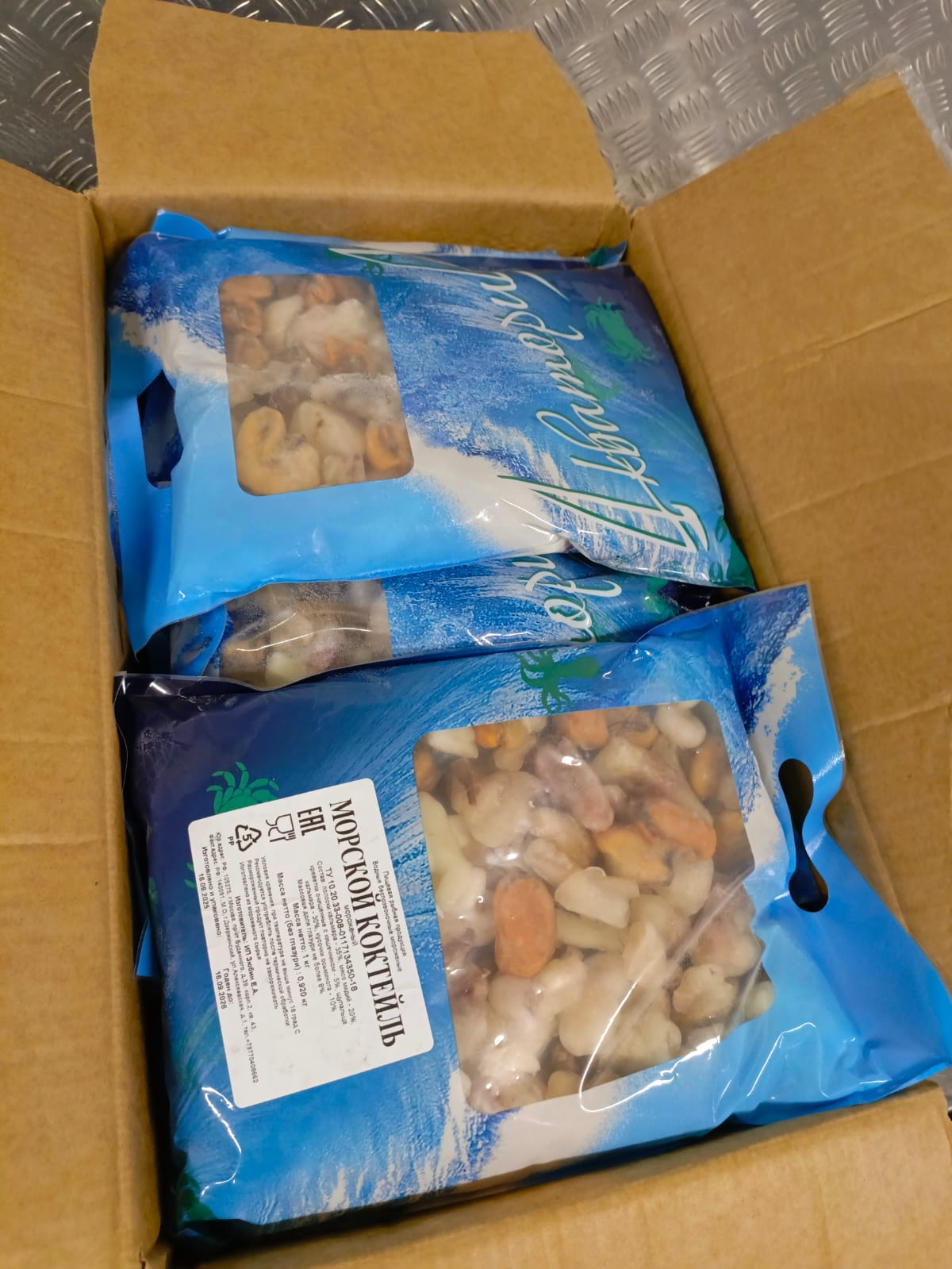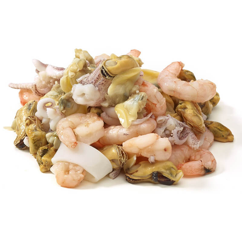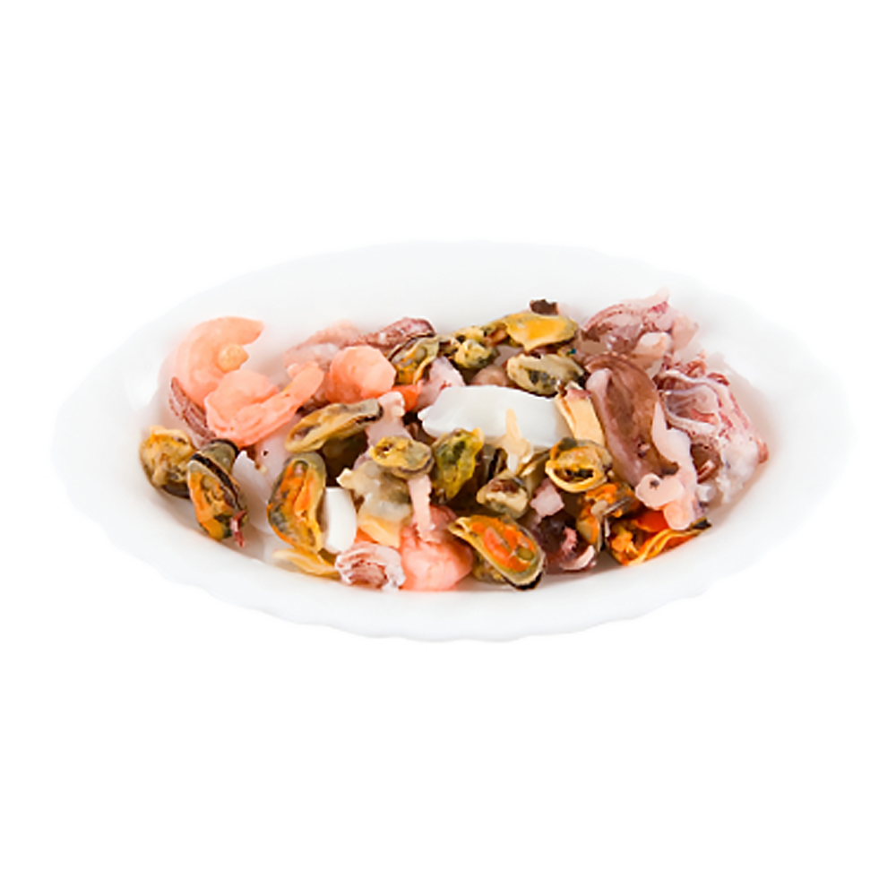 Состав4% креветки, 35% кальмар, 25% мидии, 20% моллюски, 10% щупальца осьминога¶Условия хранения: 24 месяцев при температуре -18C. Повторно не замораживать. Глазурь: 7%